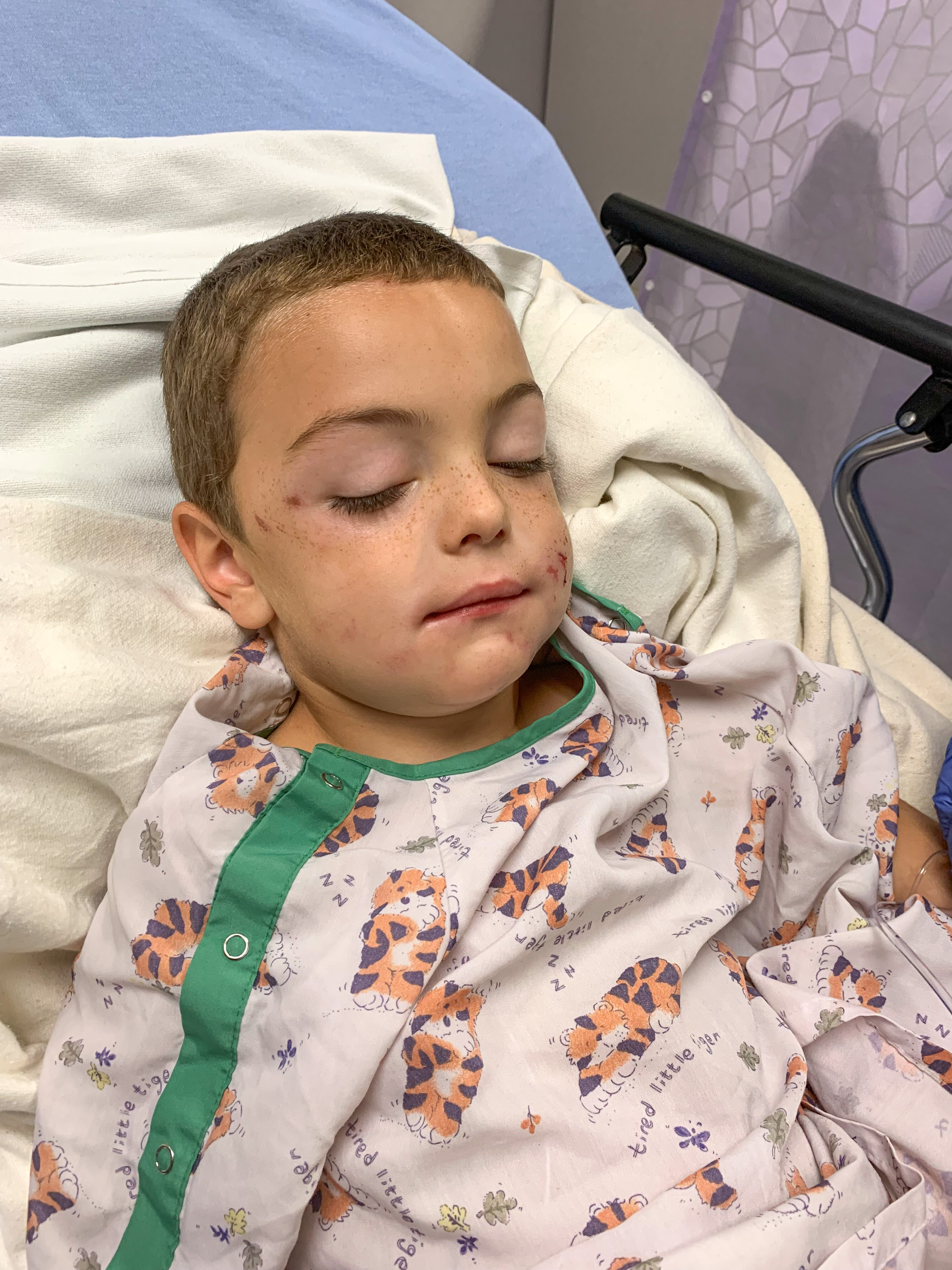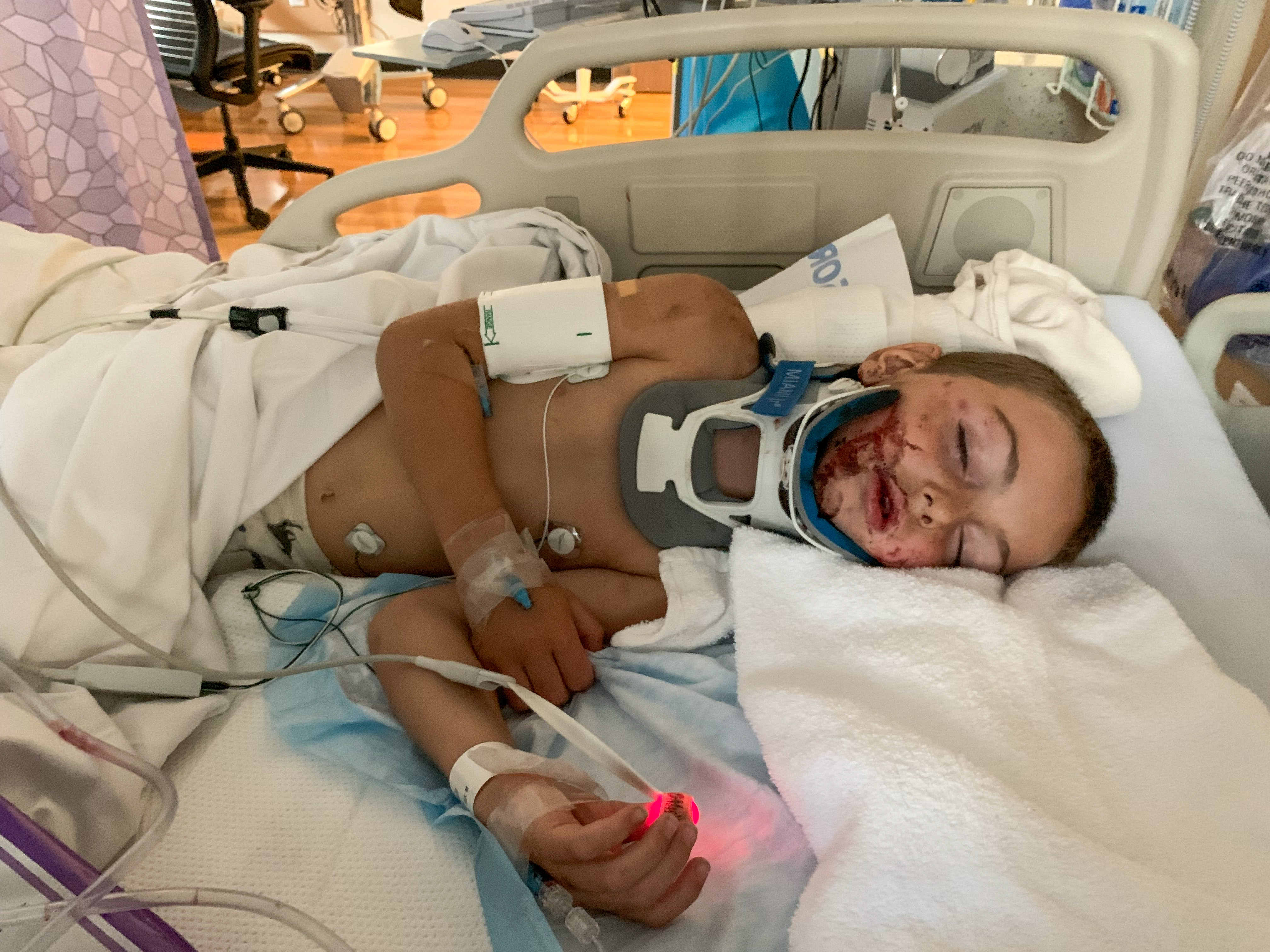We landed and I followed the tactical team and nurses from the air pad into the hospital, while texting Chad we made it safely! Nurses and doctors rushed and flooded the room to where Easton’s body laid on a gurney. I waited just outside the room as the tactical team, doctors and nurses all shared details about Easton and his accident. I was called in and asked even more questions regarding his medical history and accident. Easton was having a very hard time staying awake and for hours I repeated his name every couple minutes. Easton had a couple very scary episodes of vomiting large amounts of blood, that had me running out of the room yelling for nurses. Fast forward through all tests, images and talking to doctors & nurses, we were transferred to an admitting room and later learned that Easton had suffered a double mandibular fracture- his jaw was completely broken in two places, which meant his jaw was just floating. He had 3 fractured ribs, a bruised lung and pain in his neck-which meant he had a C-collar on until doctors could confirm there was no serious damage to his neck.