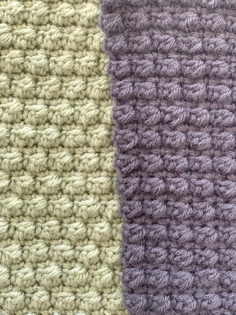 You can get creative with this stitch by lining up all of your bobbles into a row or you can stager them. To line up each row make sure you start each bobble row the same. If you started with a single crochet (sc) and then a back loop bobble, make sure to do that for each row. Pictured below as the dark grey.
