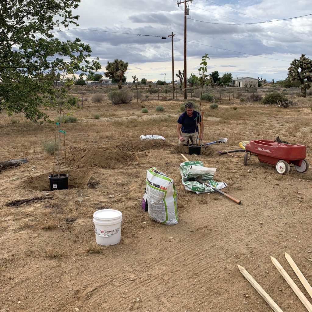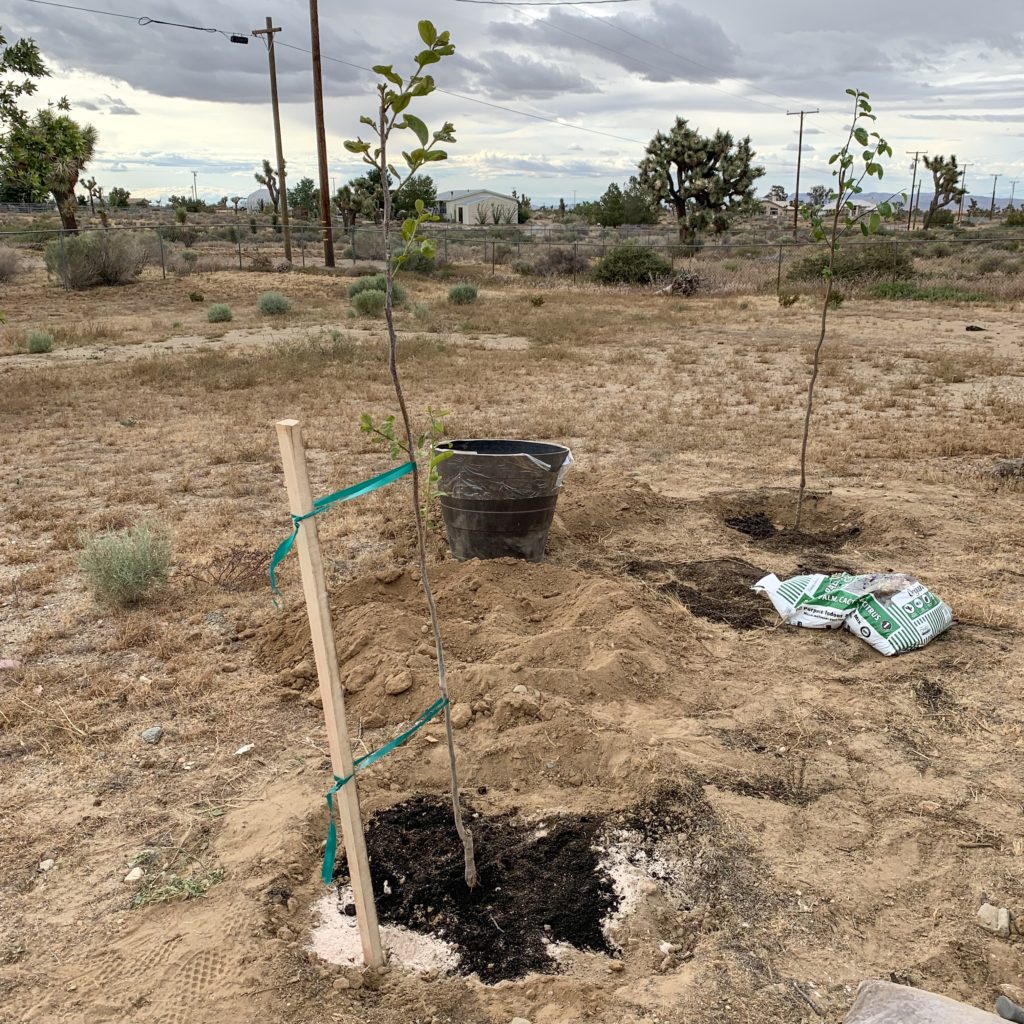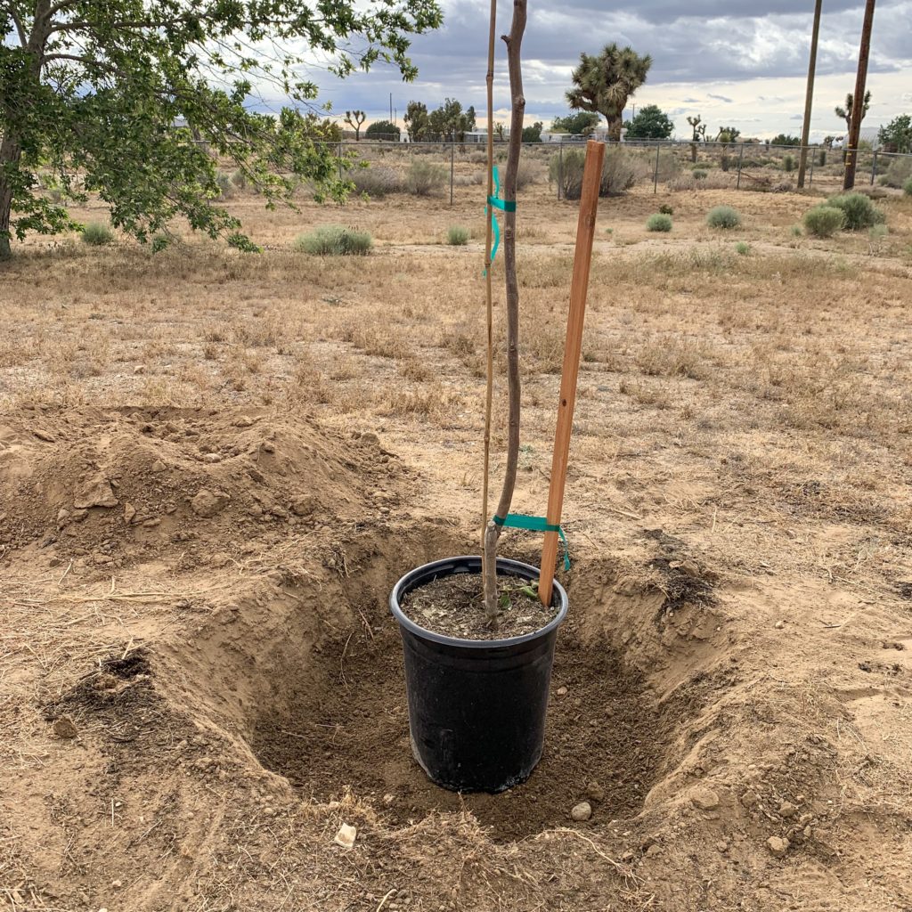 First you’ll want to consider proper sunlight, wind protection and irrigation. Keep in mind the saying “out of site, out of mind.” Once you have your new trees location, start digging. Using a pick axe or shovel dig a hole 2 to 3 times wide and deeper than the pot it came in.