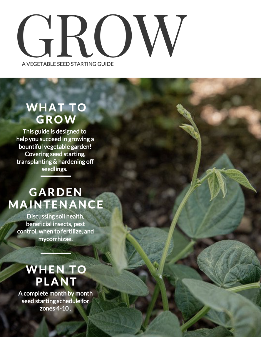 GROW – A Vegetable Seed Starting Guide designed to help you determine which seeds to start indoors, which to direct sow outside, and a timeline for both. I’ve included a comprehensive list of seed sowing directions specific to each growing zone (4-10), templates to help you keep track of your garden month by month, tips and tricks to help you succeed, and important gardening basics.