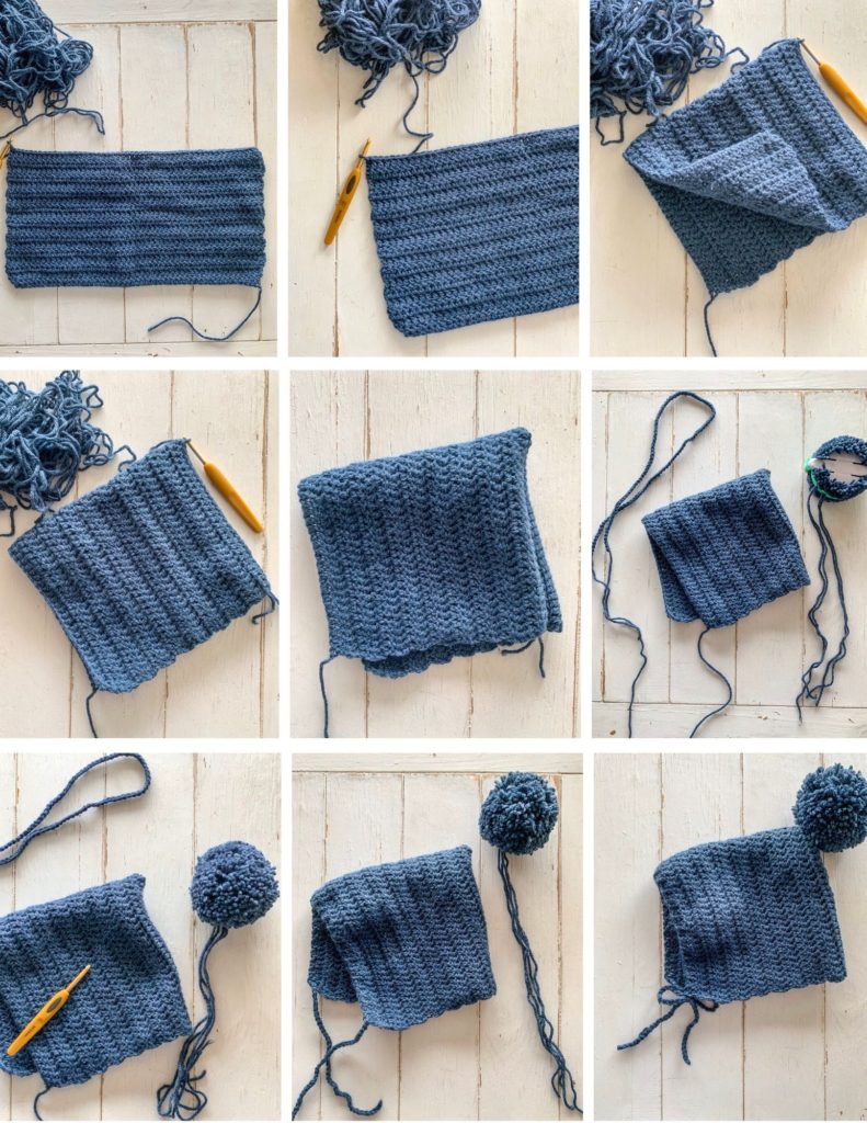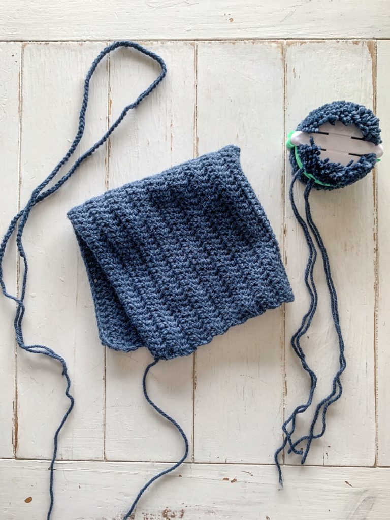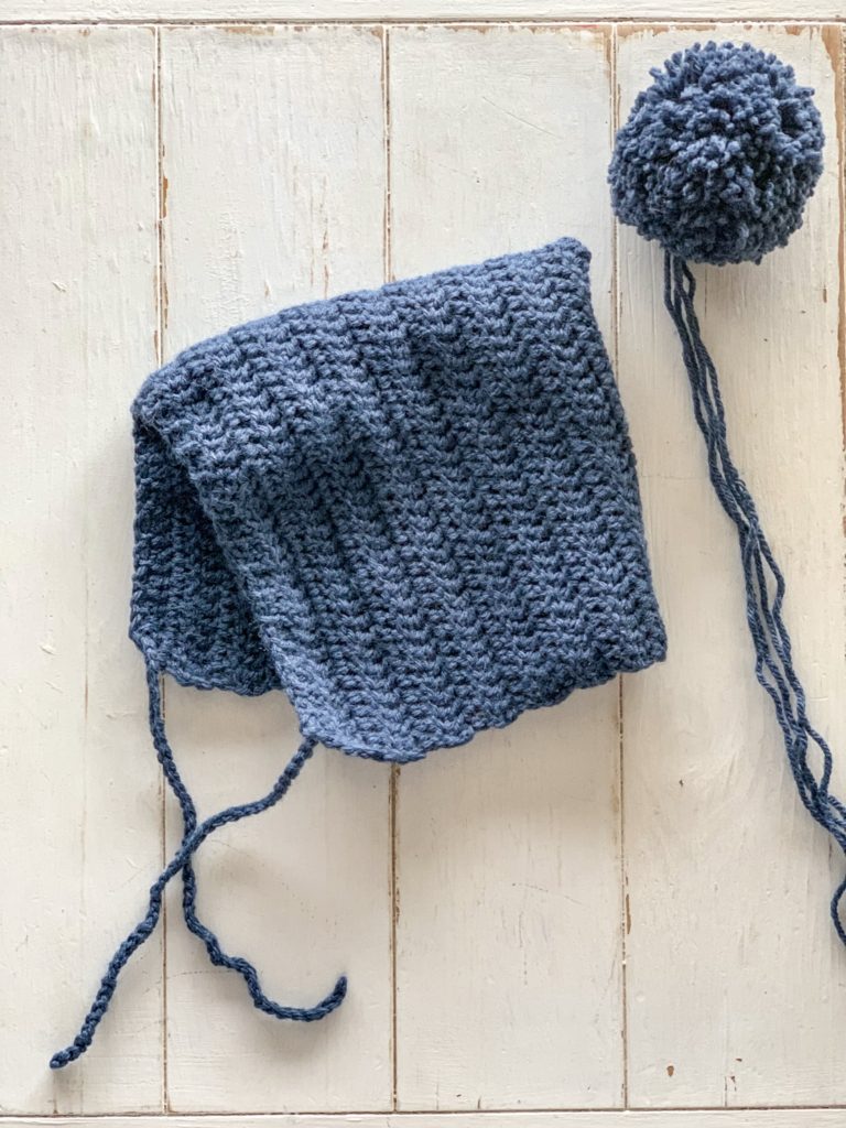 Creating the ties is very simple, you will create a long chain and weave it through the first row of the bonnet. I added a pom pom to the back corner of this child’s bonnet for a little extra cuteness but this is totally optional.